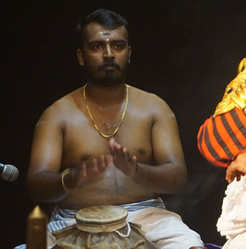 Overall, the performance progressed in a crescendo of intensity of sounds and actions which reached its peak in the last section and when all the actors were on the stage performing controlled energetic movements generated and supported by the fierce voice of the miḻāvus forcefully struck by the drummers.