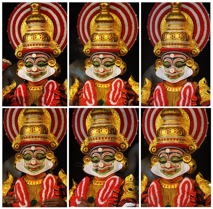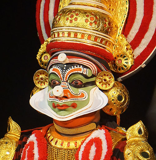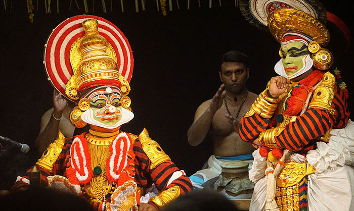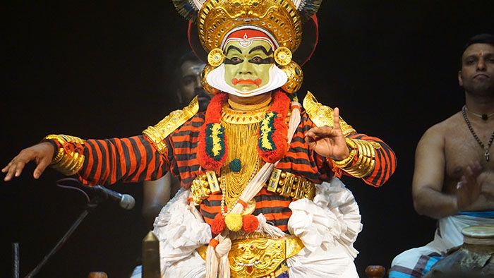 Notwithstanding the fact that, over the last few decades, some aspects have been adapted in order to make it more suitable to the needs of the new audiences attending performances in auditoriums and no more in temple theaters (kūttambalams), this art form is still filled with a medieval flavor. Intricate face painting, rich costumes, big headgears, codified hand gestures (mudrās), minute facial expressions characterize its acting technique and its sonic ambience is dominated by the sound of drums, the pot drum miḻāvu and the tension hourglass drum idakkya, and punctuated by the voice of the actors chanting Sanskrit texts in a way peculiar to this art form. Kūtiyāṭṭaṃ is a multifaceted theatrical form which asks to the performers, both actors and musicians, to control a number of aspects at the same time. But it also asks to its public specific qualities and abilities to fully appreciate it in its complexity. Furthermore, although contemporary staging usually lasts a couple of hours, some performances may last up to six hours. All these features explain why the audiences are not numerous.