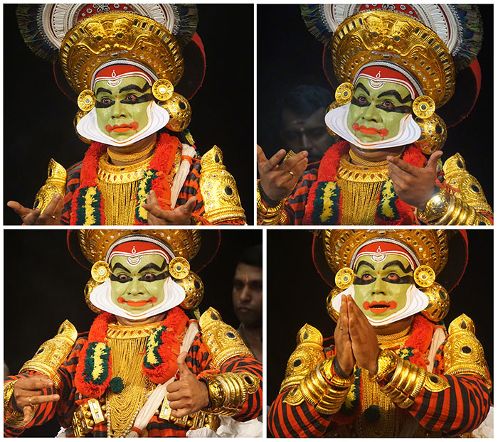 While battles scenes, where actors may display their energy and act with their full body and drummers have to energetically strike the skin of the miḻāvu to produce its fierce voice, are particularly strong, theatrically efficacious and hence relatively simple, romantic and introverted scenes are delicate and risky. Indeed, in such scenes the actor, standing or sat on a stool, has to narrate his/her own feelings in a detailed and intimate manner by means of minute eye expressions and codified hand gestures and the drummers have to play slow or middle speed tālas with dynamics ranging between piano and mezzo forte. This kind of delicate and detailed scenes are particularly demanding for the audience’s attention and participation, in particular when they last more than twenty minutes.
